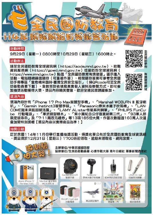 【宣導】國防部114年全民國防教育「網際網路有獎徵答活動」