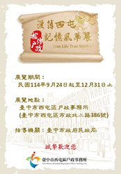 三、展覽內容:本展覽以「走進西屯時光」為出發點,結合在地文化、歷史文獻及百年戶政沿革,規劃「時光旅人-張廖家廟及眷村水湳」、「戶籍謄本、戶口名簿及國民身分證展示」、「臺灣大道特色景點」、「西屯十三庄及戶政時光迴廊」及「門牌、友達光電、行職業及漢翔工業」等5大展區。