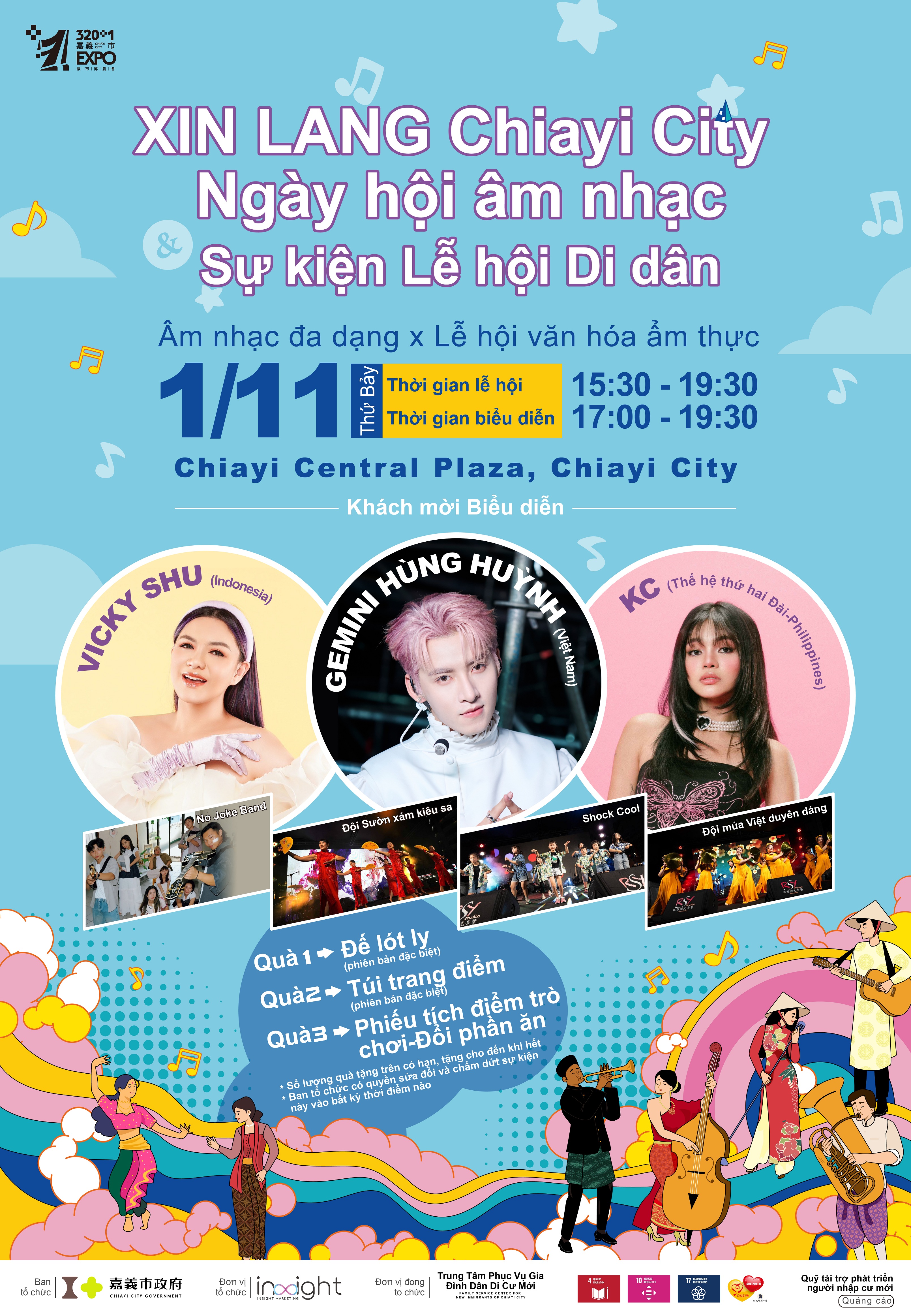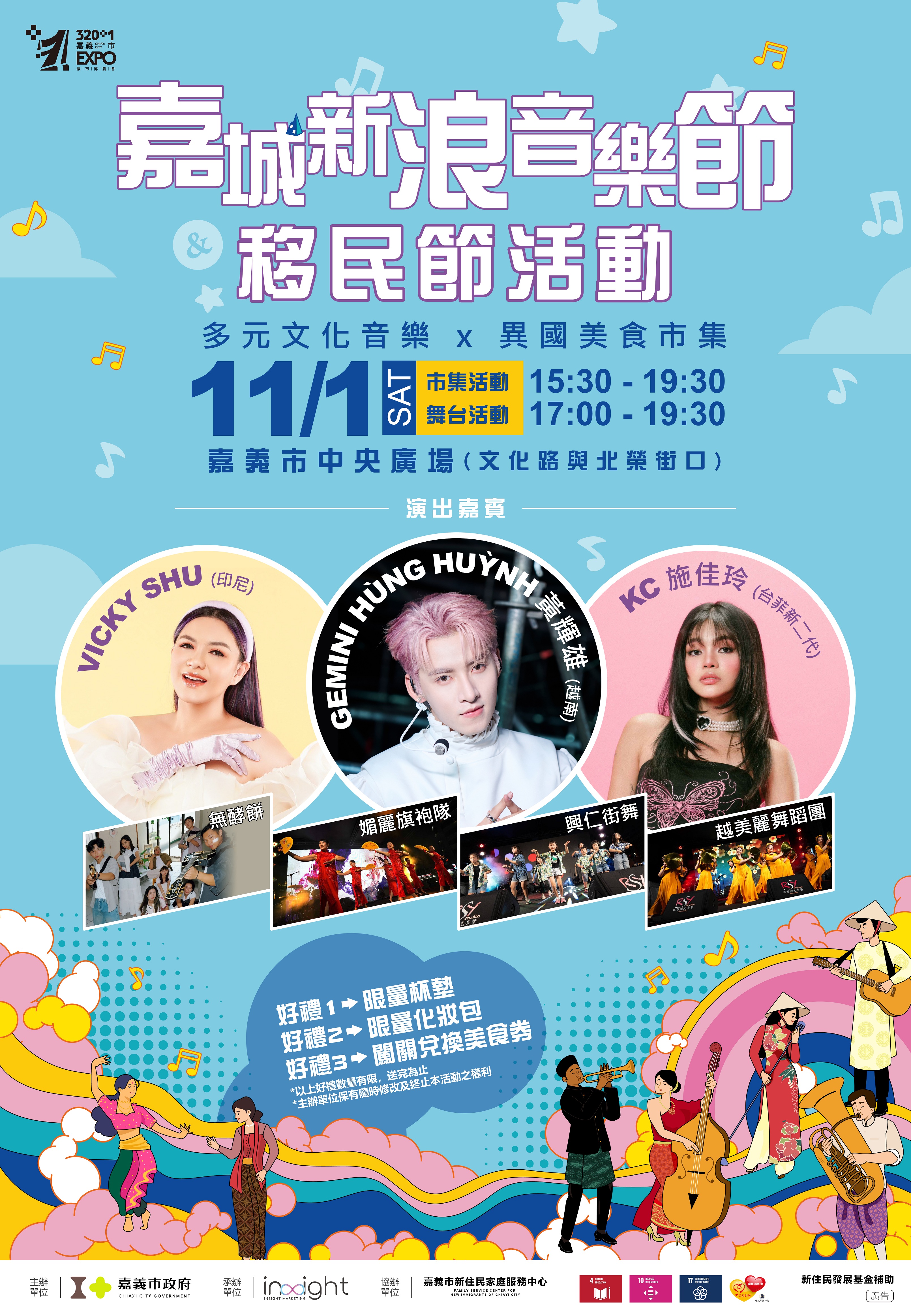 嘉城新浪音樂節暨移民節活動宣導海報 活動時間: 114年11月1日(星期六)15時30分至19時30分 活動地點: 嘉義市中央廣場(嘉義市文化路與北榮街口) 活動邀請來自越南、印尼的異國歌手、新住民及新二代表演團體,以音樂舞蹈的交流形式進行異國音樂文化演出,並設置異國美食文創市集攤位,推動多元族群共融,歡迎踴躍參加。