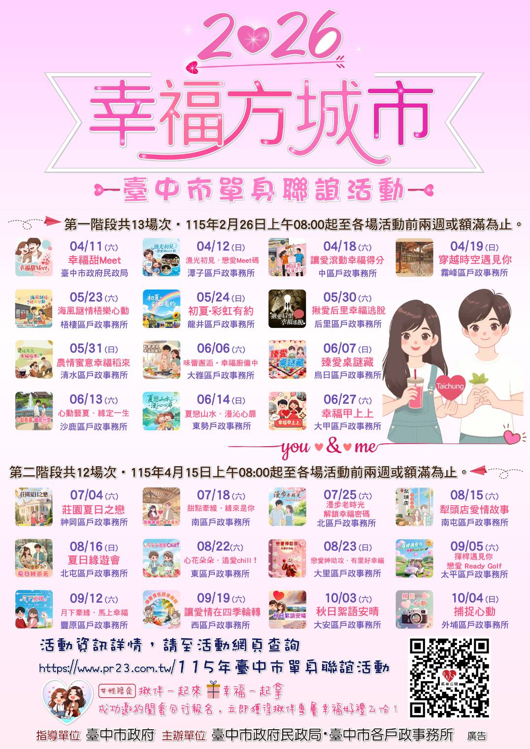 今年度共規劃25場次,由臺中市政府民政局主辦首場推出「幸福甜Meet」,透過互動式遊戲,於活動中自然開啟對話、認識彼此。上半年場次已全數幸福額滿,於下半年辦理12場次,快來報名參加,找到跟你/妳有共同興趣的人生伴侶!